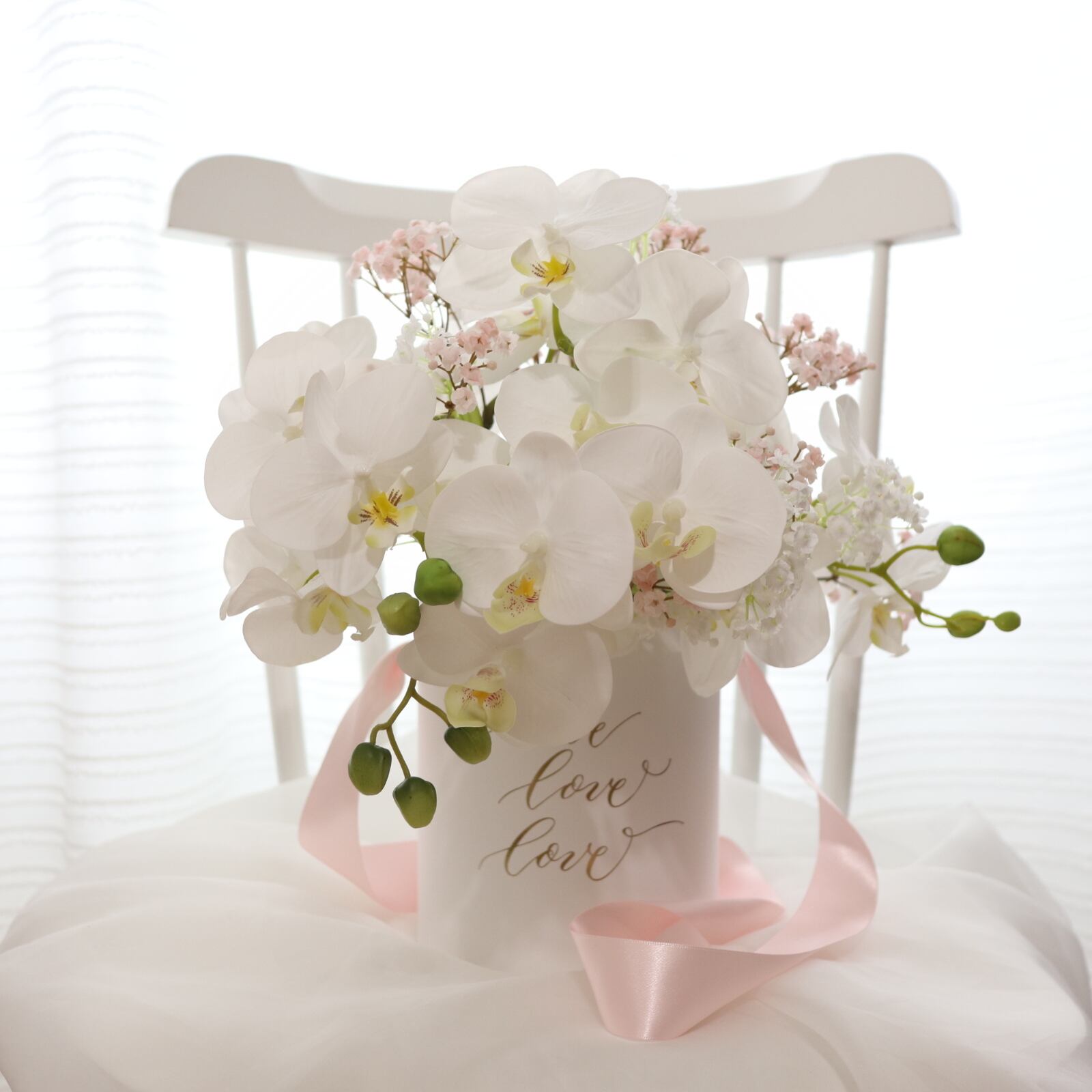 三原亮介氏監修のカリグラフィーBOXを正規お取り扱いしており、別売りで購入いただけます。こちらのブーケにはホワイト色を合わせています。