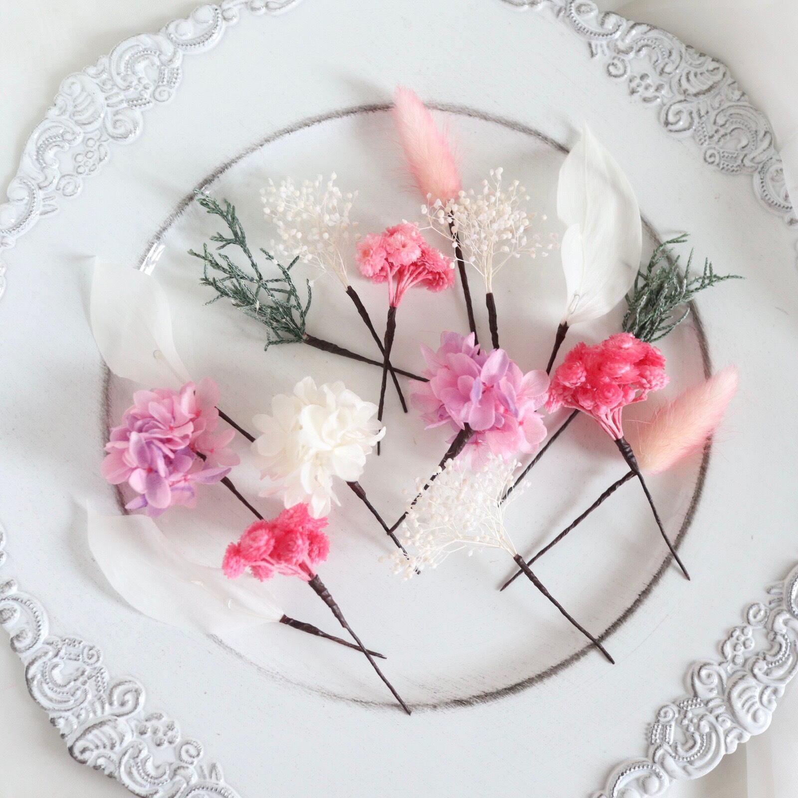 かすみ草、ラグラス、あじさい、イモーテル、ラスカス、ブルーアイス